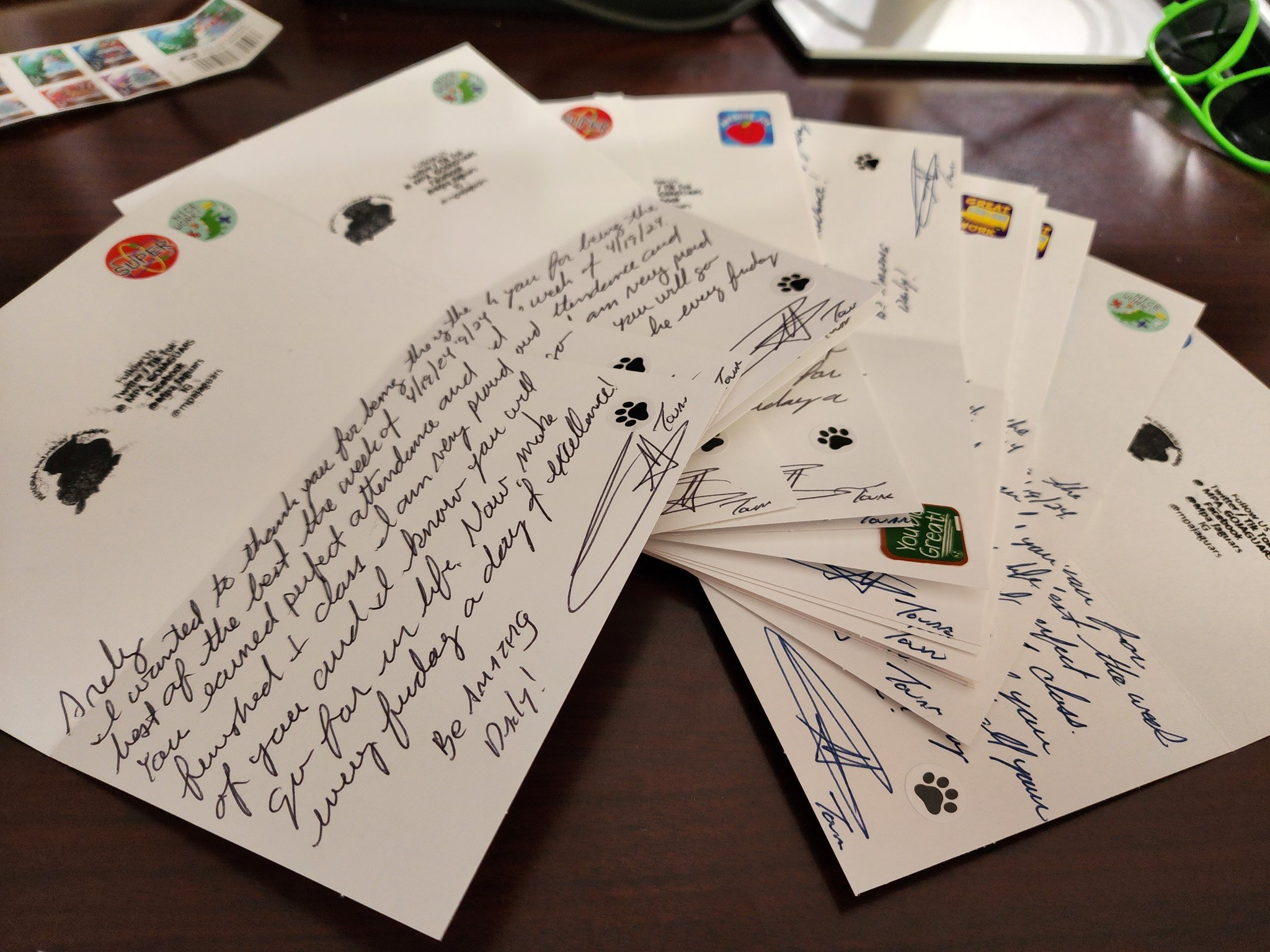 Once per month, our team members write two thank-you cards to students and one to each other. Right before that, I invite the kids to write one thank-you card to a teacher. I drop all these cards in the mail. Right now, I have 80 that I’m going to take to a mailbox and send out to all the teachers and kids.